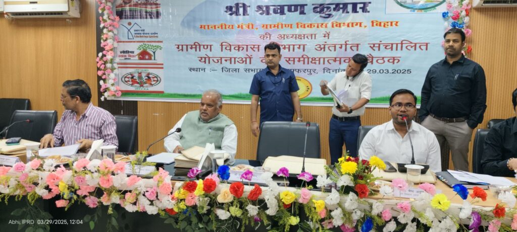 गांव तथा गांव की गरीब जनता के हित में संवेदनशील एवं जवाबदेह होकर सरकारी प्रावधान एवं प्रक्रिया का पालन करते हुए ससमय कार्यों का निष्पादन करें। यह बातें माननीय मंत्री, ग्रामीण विकास विभाग, बिहार श्री श्रवण कुमार ने समाहरणालय सभागार में ग्रामीण विकास विभाग अंतर्गत संचालित योजनाओं की समीक्षा बैठक करते हुए कही। बैठक में मनरेगा योजना, जल जीवन हरियाली, जीविका, प्रधानमंत्री आवास योजना ग्रामीण, लोहिया स्वच्छ बिहार अभियान आदि की समीक्षा कर कार्य की प्रगति एवं उपलब्धि की जानकारी प्राप्त की तथा आवश्यक निर्देश दिया।